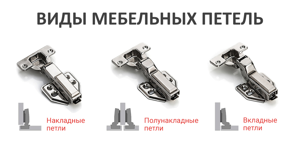Существует три основные группы мебельных петель, каждая из которых включает несколько подтипов: