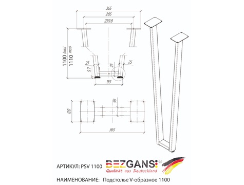Подстолье V-образное фигурное для барной стойки высотой 1100 мм. Ширина подстолья в месте крепления к столешнице 550 мм. Прочная и надежная цельносварная конструкция выполнена из квадратной стальной трубы 50х25 с толщиной металла 1,5 мм. Надёжные подпятники аккуратно интегрированы в основание опоры, они необходимы для того, чтобы обезопасить ваше напольное покрытие от царапин. Нагрузка до 70 кг на одну опору.