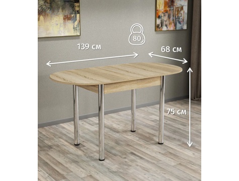 Размеры стола составляют 109х68 см в собранном виде и 139х68 см в разложенном. Высота стола - 75 см. Вес стола - 18 кг.