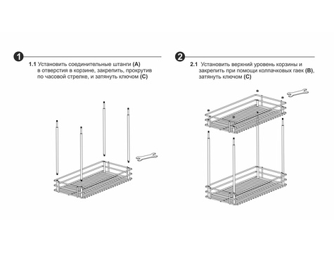 В нижнюю корзину вкрутить по резьбе боковые стойки, затянуть, а затем сверху надеть вторую корзину. Какая из корзин будет верхней/нижней не важно, они универсальные. После этого верхняя корзина крепится гайками и затягивается ключом. Всё необходимое для этого есть в комплекте.
