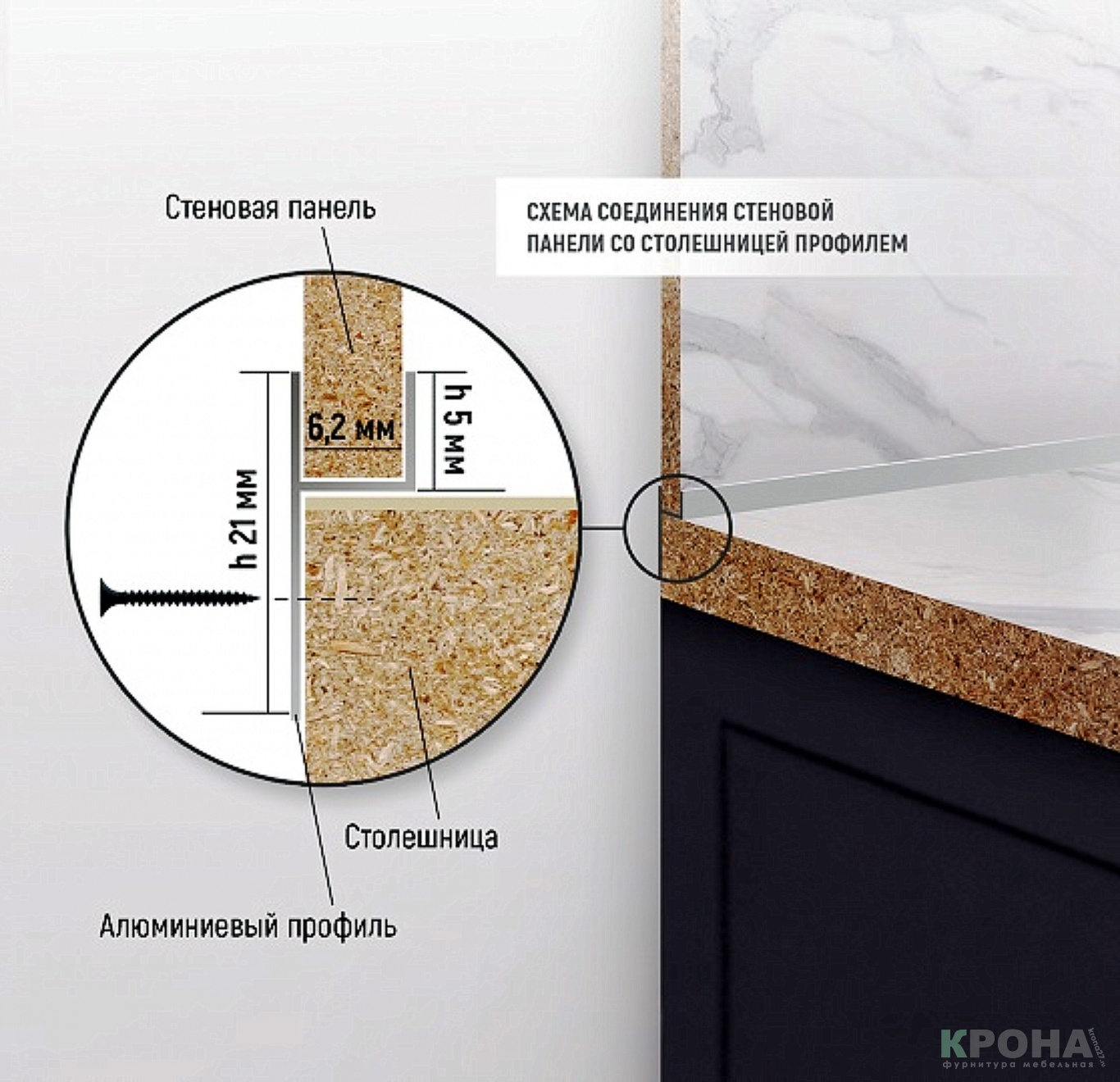 Компактность видимой части придает кухне элегантный, современный внешний вид, экономит место на столешнице и открывает интересные возможности для дизайнеров в плане комбинирования декоров. К тому же облегчает установку фартука и обеспечивает надежное соединение со столешницей.