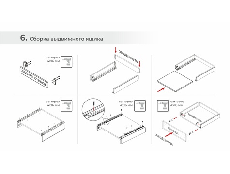 Сборка выдвижного ящика СТАРТ PUSH+SOFT проводится по аналогии со сборкой других типов СТАРТ, за исключением одного момента: при креплении боковины ко дну выдвижного ящика необходимо дополнительно прикрепить рейку ответной части механизма PUSH через пластину крепления боковой стенки. Для простоты процесса на рейке предусмотрены специальные выступы, которые входят в отверстия пластины боковой стенки.