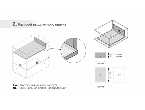 Для сборки выдвижного мебельного ящика на базе СТАРТ PUSH+SOFT SB38 необходимо самостоятельно изготовить фасад, заднюю стенку и дно мебельного ящика. Дополнительные рейлинги позволяют увеличить полезную высоту боковых стенок выдвижного ящика. Рейлинги и держатели к ним приобретаются отдельно.