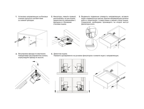 Для наиболее прочного монтажа направляющих длиной от 400 мм к плоскости мебельного изделия рекомендуется прикрутить каждую направляющую в 2 ряда присадочных отверстий задней крепёжной площадки.