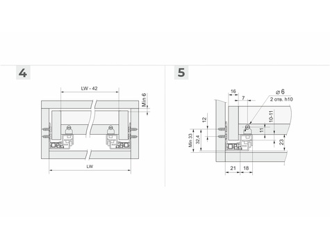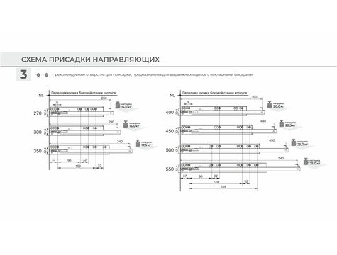 В коротких длинах направляющих DB8785 (250-350 мм) предусмотрено смещение оси присадочных отверстий. Это обеспечивает точное и плотное прилегание фасадов к боковинам мебельного корпуса, даже если неглубокий выдвижной ящик устанавливается с габаритными, высокими фасадами.