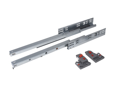 B-Slide DB8785 — базовые направляющие скрытого монтажа полного выдвижения с открытием от нажатия и выверенным набором опций и возможностей для мебельных производителей.