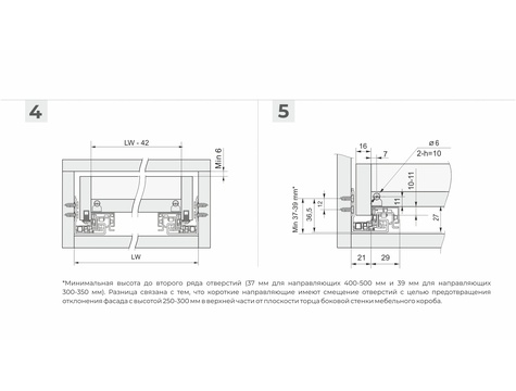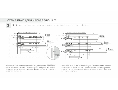 В коротких длинах направляющих DB8785 (250-350 мм) предусмотрено смещение оси присадочных отверстий. Это обеспечивает точное и плотное прилегание фасадов к боковинам мебельного корпуса, даже если неглубокий выдвижной ящик устанавливается с габаритными, высокими фасадами.