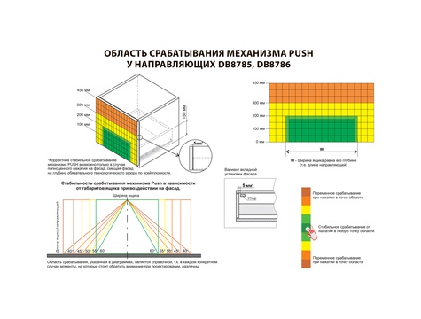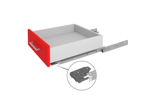 В направляющих предусмотрены дополнительные металлические упоры на подвижной и неподвижной частях направляющих для сдерживания давления в момент установки и в процессе эксплуатации. Это снижает риски излома механизма PUSH, а также избавляет от необходимости создания дополнительных упоров при создании выдвижных ящиков с вкладным типом фасадов.