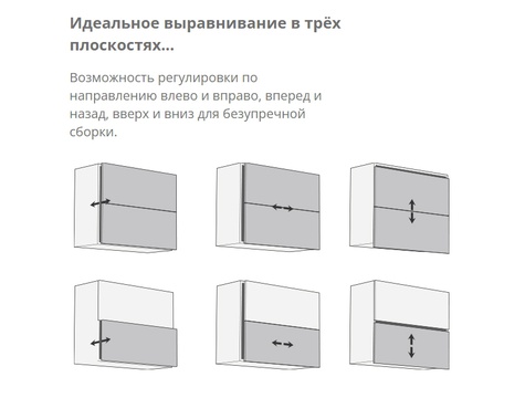 - Регулировка нижнего фасада: по высоте (+/-3 мм) – по ширине (+/-2 мм) – по глубине (+/-2 мм)